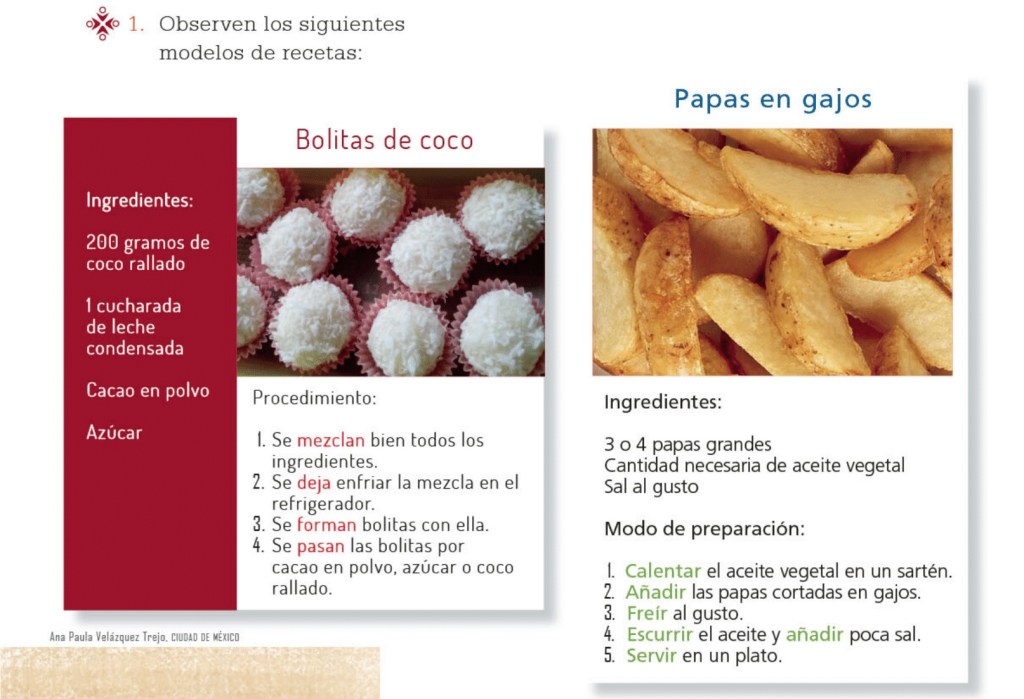 En la imagen anterior se pueden observar dos modelos de recetas, esto se debe principalmente por la redacción a pesar de contar con los mimos elementos (título, ingredientes, imágenes y procedimiento). De acuerdo con el libro de textos, nos menciona lo siguiente: