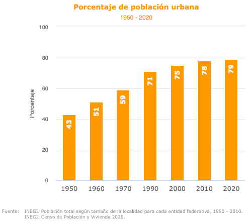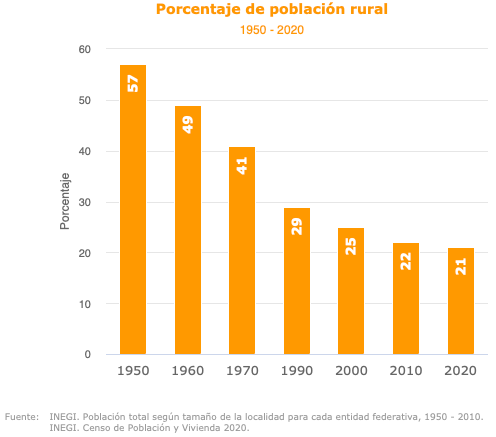 La gráfica muestra la evolución de la población rural y urbana de México desde 1950 hasta 2020. Podemos ver cómo la población urbana ha ido aumentando de manera constante en los últimos años, mientras que la población rural ha disminuido. También se muestra que la población urbana superó a la población rural en 1965.