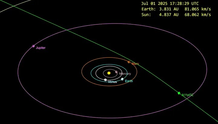 Descubierto el 1 de julio de 2025 por el sistema ATLAS (Asteroid Terrestrial-impact Last Alert System) en Chile, este objeto, inicialmente llamado A11pI3Z, capturó de inmediato la atención de la comunidad astronómica. Sus credenciales son impresionantes: una velocidad vertiginosa de 150,000 millas por hora (unos 66 km/s) y una órbita hiperbólica excéntrica que grita “no soy de por aquí”. Su tamaño, estimado en unos colosales 20 kilómetros de diámetro, lo hace mucho más grande y brillante que sus predecesores, ‘Oumuamua y Borisov. Su trayectoria lo trae desde la constelación de Sagitario, y su punto más cercano al Sol será en octubre, pasando justo por dentro de la órbita de Marte, aunque, afortunadamente, sin representar ninguna amenaza para la Tierra.